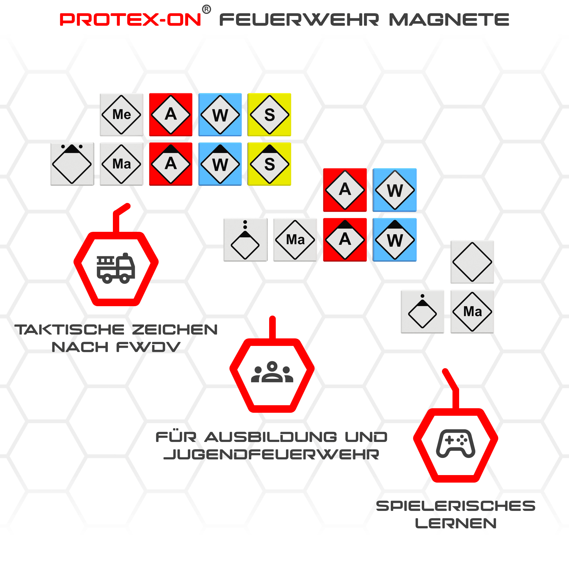 Das PROTEX-ON Magnetset wurde speziell für Feuerwehr-Ausbildung, Jugendfeuerwehr und Übungsdienste entwickelt und orientiert sich an den taktischen Zeichen nach FwDV.